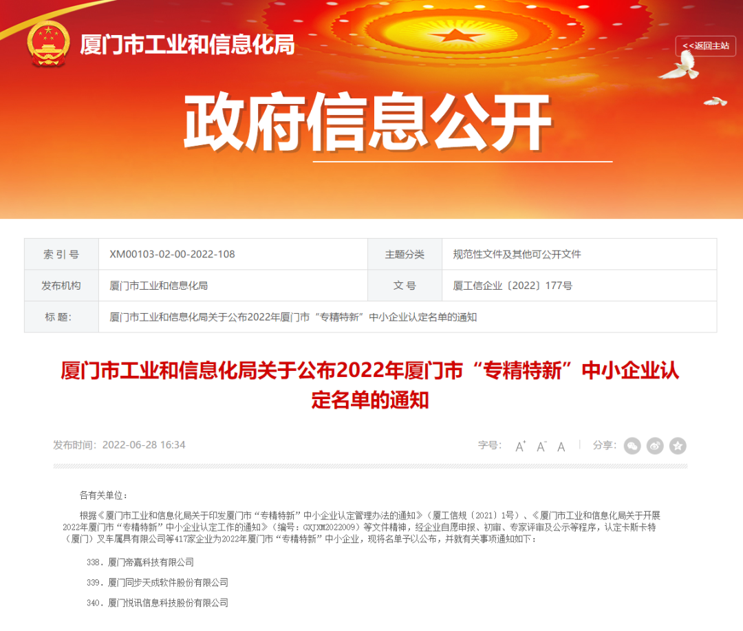 喜讯│近日,同步天成喜获“专精特新”牌匾。今年6月,厦门市工业和信息化局发布《关于公布2022年度厦门市“专精特新”中小企业认定名单的通知》(厦工信企业〔2022〕177号),厦门同步天成软件股份有限公司获得厦门市“专精特新”企业认定。